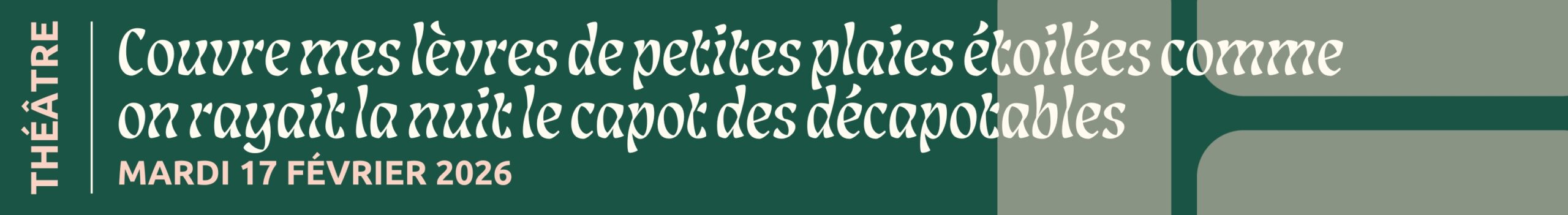 L’histoire ? Il y en a pas vraiment. Les personnages, sans nom, sont simplement là, dans ce cabaret, à partager un moment d’humanité. Des histoires ? Oui, il y en a plein, toutes celles cachées dans les poèmes et chansons d’Alice, Aurora, Virgine Despentes, Dinaa, Brigitte Fontaine, GiedRé, Jeannette, Laurène Marx, Larry Mitchell, Corinne Masiero, Sandra Moussempès, Estelle Pernaud, Ptite Sœur, Agathe Saint Maur, Anne Sylvestre, Kae Tempest, Laure Vazquez, Clara Ysé et d’autres. Que des femmes, oui. Pour dire des contes et des lettres aux jeunes poétesses.